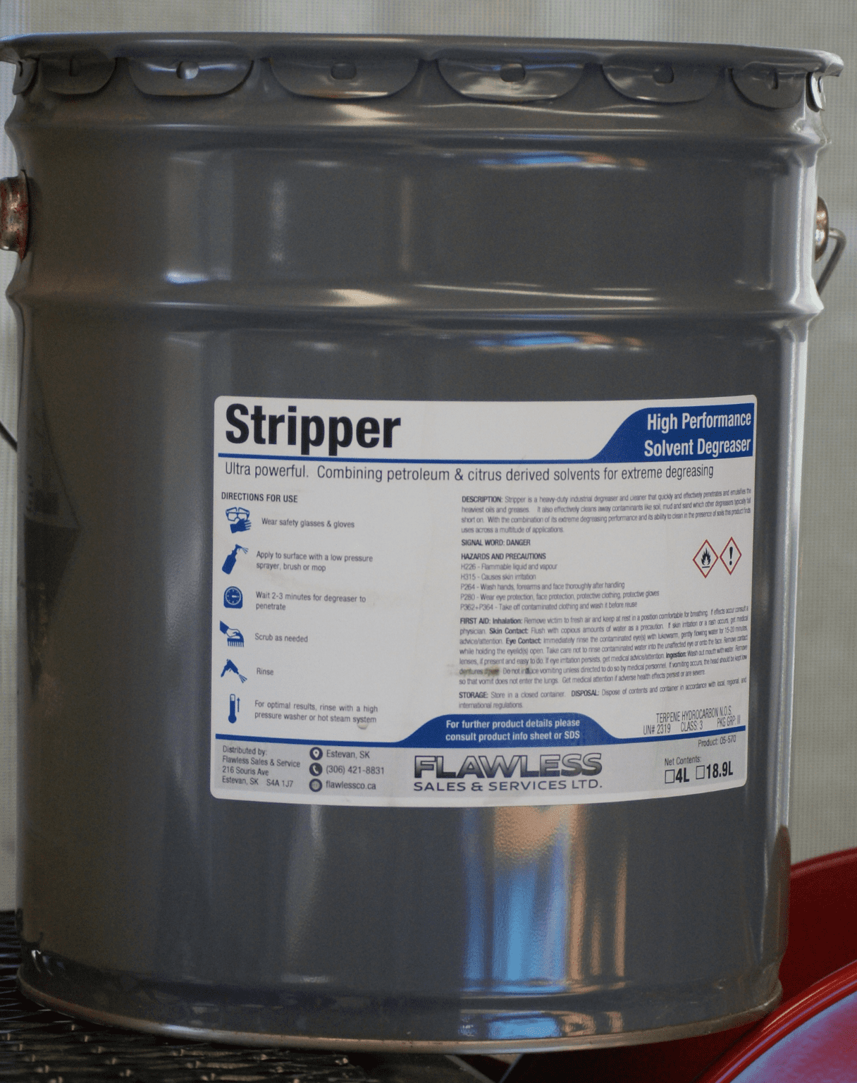 STRIPPER is a heavy-duty industrial degreaser and cleaner that quickly and effectively penetrates and emulsifies the heaviest oils and greases. It also effectively cleans away contaminants like soil, mud and sand which other degreasers typically fall short on. With the combination of its extreme degreasing performance and its ability to clean in the presence of soil this product finds uses across a multitude of applications.